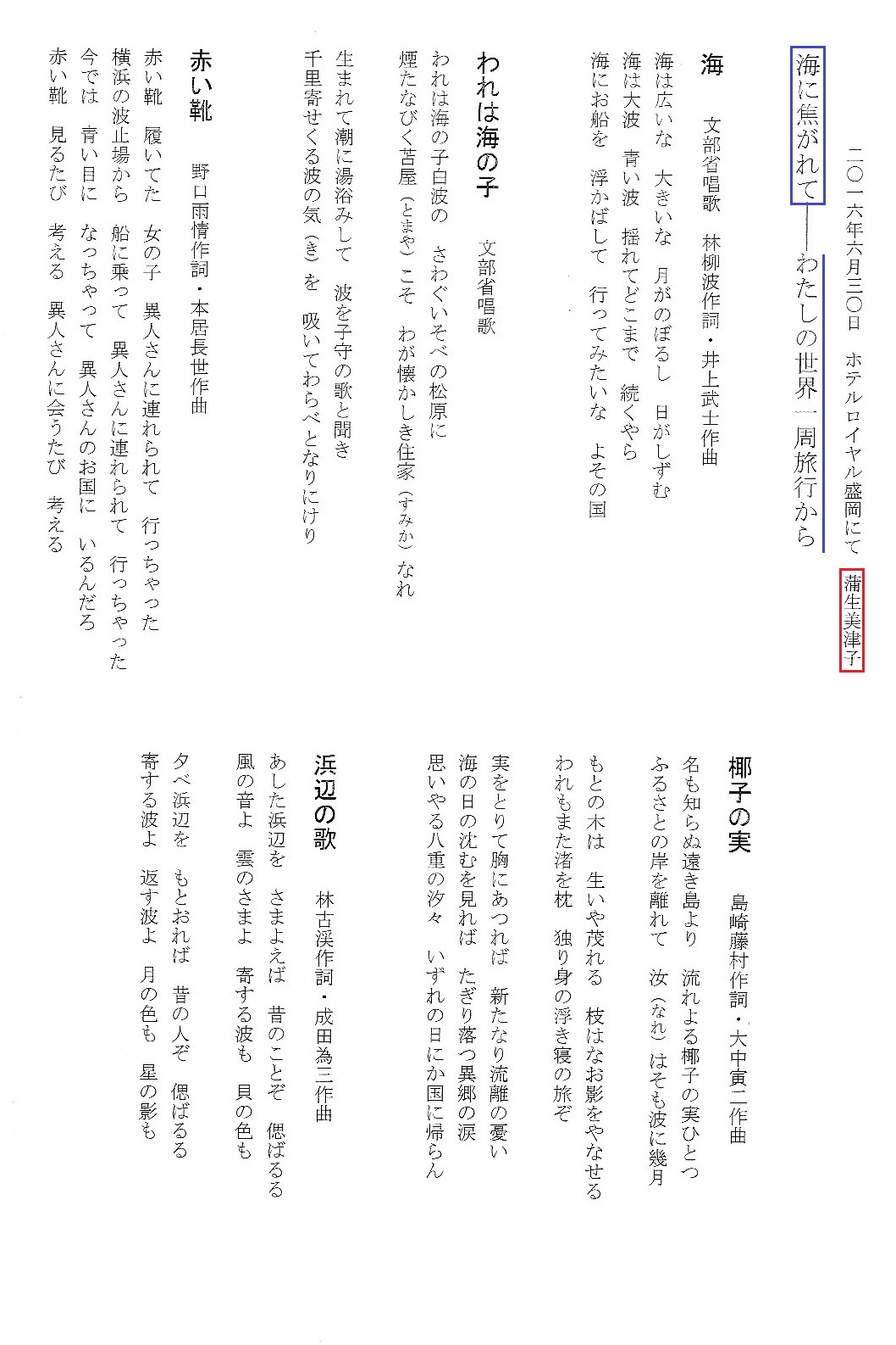 盛大な拍手が送られた。次に蒲生さんのピアノに合せて海の歌『海』『われは海の子』『赤い靴』