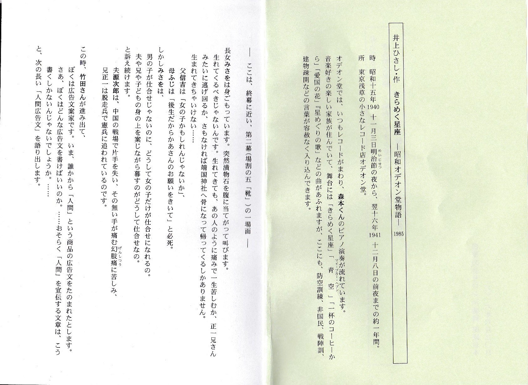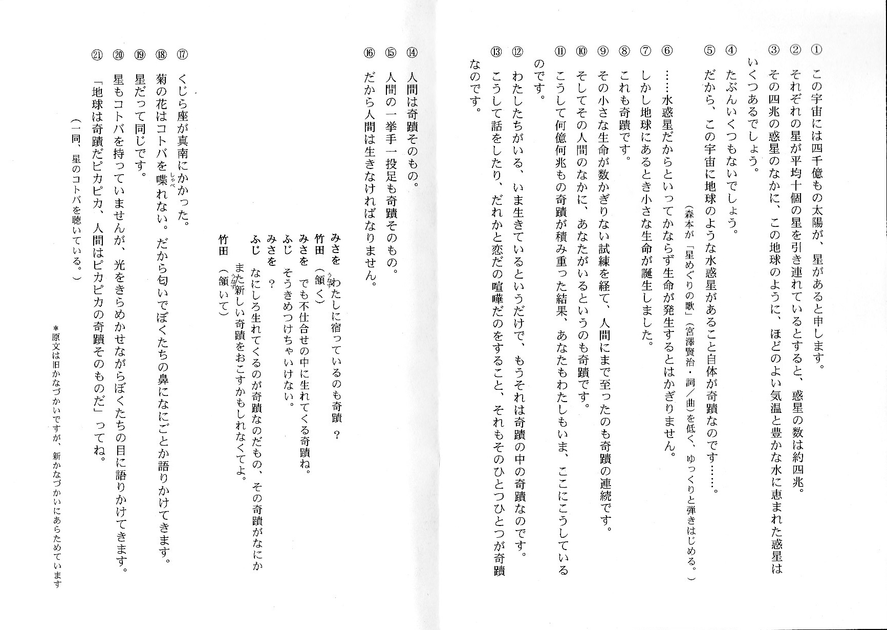 朗読は井上ひさし作の戯曲『きらめく星座』を題材にした。テーマは地球や生命の誕生は奇跡